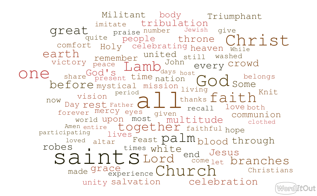 The Feast of All Saints is the most comprehensive of the days of commemoration within the Church year, encompassing the entire scope of that great cloud of witnesses that surrounds us (Hebrews 12:1). It holds before our eyes of faith that great multitude which no man can number: all the saints of God in Christ—from every nation, race, culture, and language—who have come out of the great tribulation … who have washed their robes and made them white in the blood of the Lamb” (Revelation 7:9, 14).