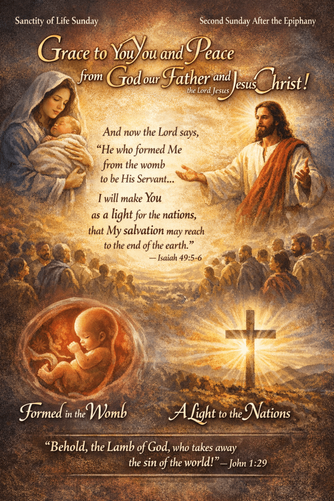 It is the Second Sunday after the Epiphany, the season of the year in which we focus on Jesus revealing Himself as God Incarnate, the Savior of all mankind. It is also Sanctity of Life Sunday. So, it is fitting that our Old Testament lesson, Isaiah 49, is serving double duty today. Let’s focus especially on verses 5 and 6: